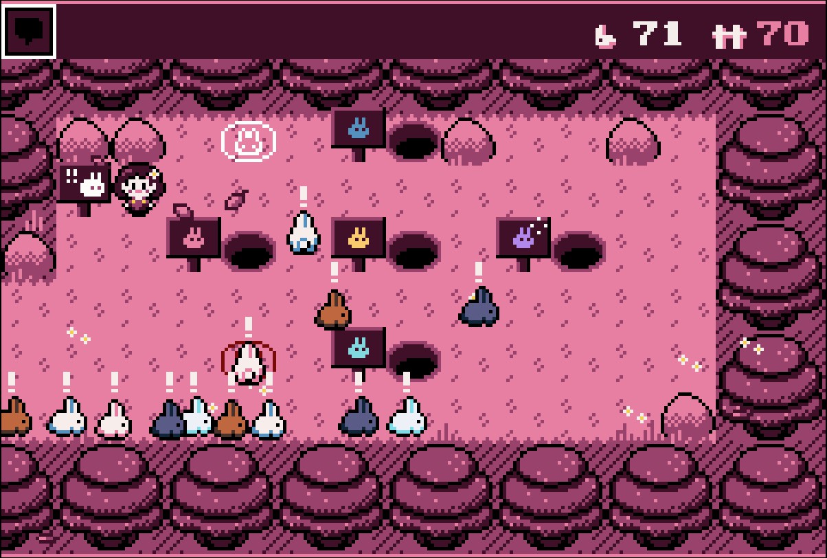 在今年年初我决定尝试多玩一些类推箱的sokoban游戏,因为近年来在这个传统玩法上的创新属实不少。我买了两款游戏,其中抓兔子就是让我一眼相中的那一款。抓兔子不仅做到了设计一个足够完整的“反向推箱子”机制,还构建了纵横双向的地图联动机制,游戏的深度一下就拓宽到了三维。加之生叠兔兔机制(是的我的记录是叠了8个,但是这远不是极限),产生了一个巨大的,令核心玩家乐此不疲的探索空间。甚至听说一些组合是靠算法搜索出来的,在早前版本甚至未能发现。