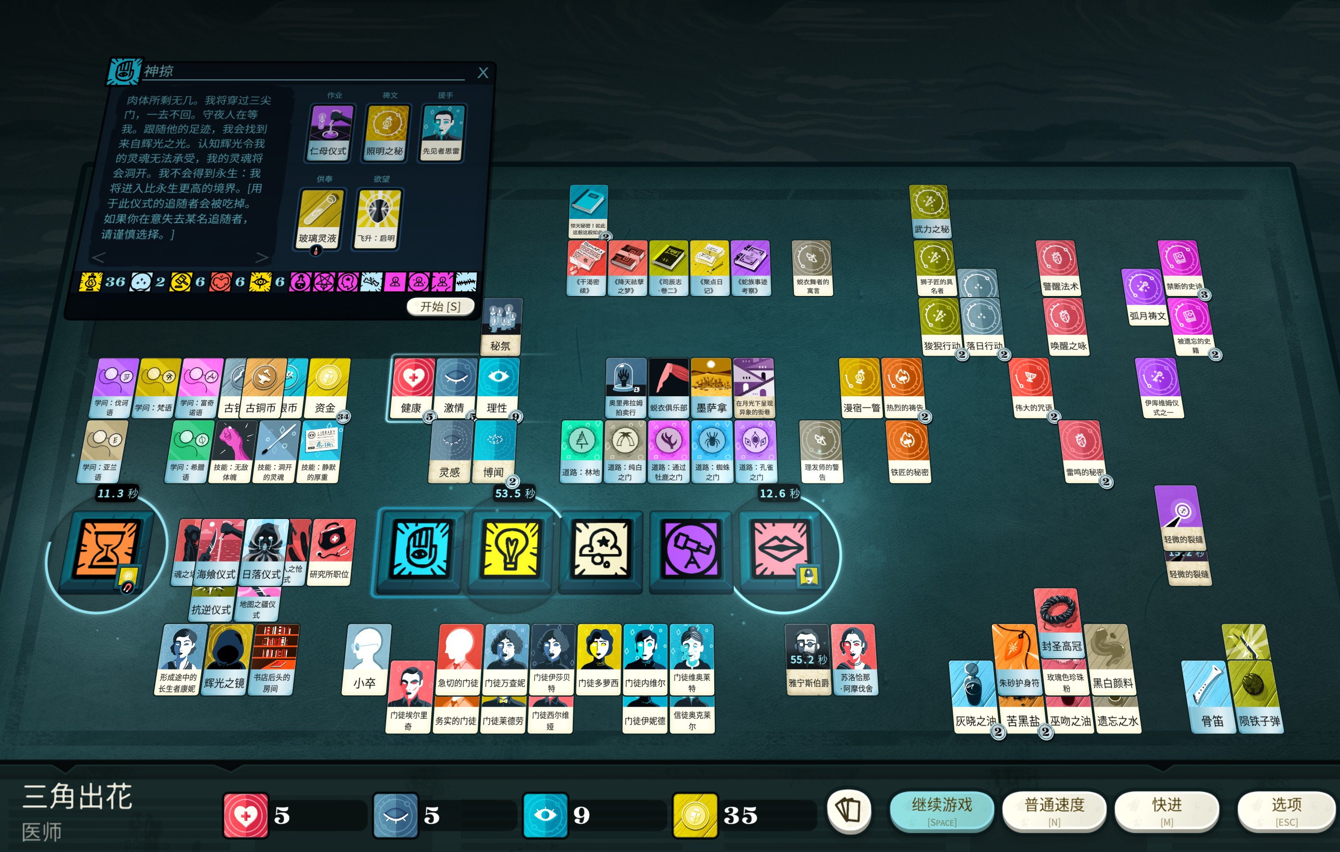 最终我打通了三个结局,如果对于一个神秘学爱好者,阅读密教的文本本身确实还是蛮享受的,但是对于一心只想着最大化资源管理收益的我来说,它们就变成了另一种抽象的符号。探索不同的组合事件获得发现的乐趣也不错,可惜受困于无法回退的机制,不事先查wiki的话要付出巨大的时间成本……也许矛盾就是这个游戏的本色吧。